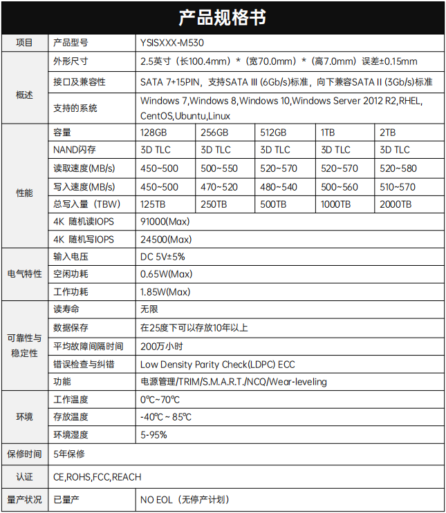 YSISXXX-M530產(chǎn)品采用2通道SSD控制器和3D NAND Flash,接口尺寸為2.5寸 SATA。YSISXXX-M530符合串口ATA I/II/III標準并支持SATA 3.2協(xié)議。 YSISXXX-M530使用3D TLC NAND Flash。