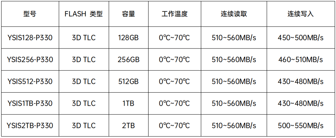 YSISXXX-P330 使用3D TLC NAND Flash。為了保證數據的完整性,采用了動態壞塊管理、動靜態磨損平衡、LDPC校驗糾錯等先進的技術。此外,YSISXXX-P330的性能遠超于傳統硬盤。