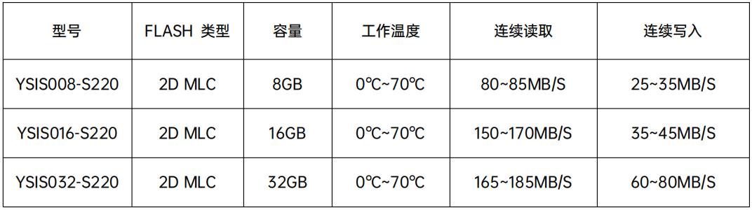 YSISXXX-S220符合串口ATA I/II標準并支持SATA 2.0協議。為了保證數 據的完整性,采用了動態壞塊管理、動靜態磨損平衡、BCH校驗糾錯等先進的技術。