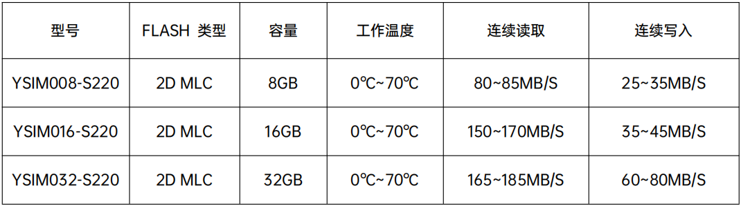 YSIMXXX-S220符合串口ATA I/II標 準并支持SATA 2.0協議。為了保證數據的完整性,采用了動態壞塊管理、動靜態磨損平衡、BCH校驗糾錯等先進的技術。此外,YSIMXXX-S220的性能遠超于傳統硬盤。