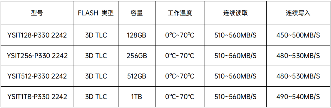 YSITXXX-P330 2242使用3D TLC NAND Flash。因此,為了保證數據的完整性,采用了動態壞塊管理、動靜態磨損平衡、 LDPC校驗糾錯等先進的技術。此外,YSITXXX-P330 2242的性能遠超于傳統硬盤。