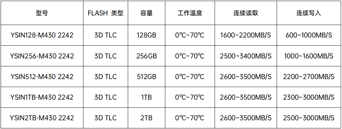YSINXXX-M430 2242產品采用4通道SSD控制器和3D NAND Flash,接口尺寸為 M.2(M Key)2242,小巧的尺寸讓該產品可以集成在平臺內。