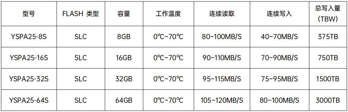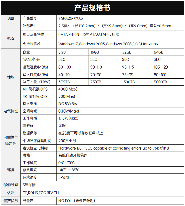 YSPA25-XXXS是一款高性能高可靠性的存儲設備,純粹由半導體器件和非易失性 NAND Flash芯片構成,基于NAND Flash技術,解決機械硬盤傳輸速度不高的瓶頸,內部沒有機械部件,解決抗震防跌落的問題。它擁有和機械硬盤完全相同的連接端口,因此可以 完全替換機械硬盤。
