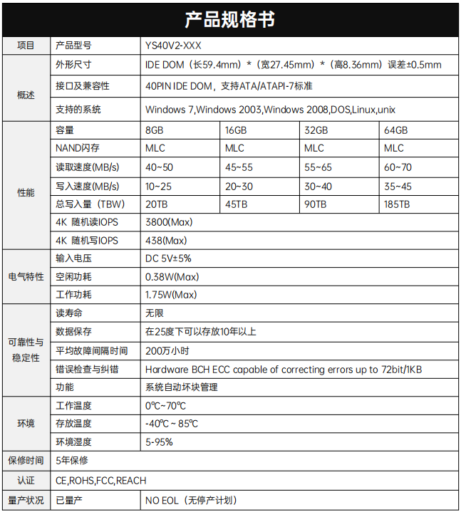 YS40V2-XXX是一款高性能高可靠性的存儲(chǔ)設(shè)備,純粹由半導(dǎo)體器件和非易失性 NAND Flash芯片構(gòu)成,基于NAND Flash技術(shù),解決機(jī)械硬盤傳輸速度不高的瓶頸,內(nèi)部沒有機(jī)械部件,解決抗震防跌落的問題。