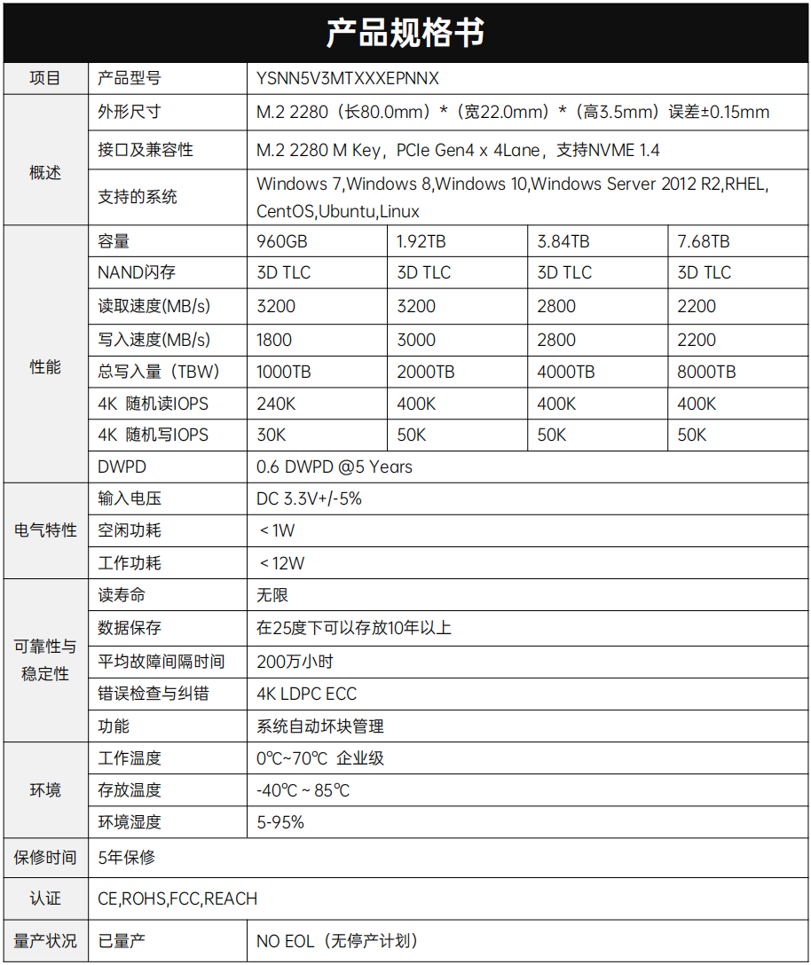 YSNN5V3MTXXXEPNNX是一款基于Marvell科技88SS1321 PCle主控搭配 3DTLC NAND 閃存陣列和DDR4 緩存的M.2 2280 NVMe固態(tài)硬盤,PCle Gen4x4的接口標(biāo)準(zhǔn),支持NVMe1.4協(xié)議,采用新一代LDPC 技術(shù)確保 NAND 的耐用性,大幅改善固態(tài)硬盤數(shù)據(jù)可靠性和穩(wěn)定性。