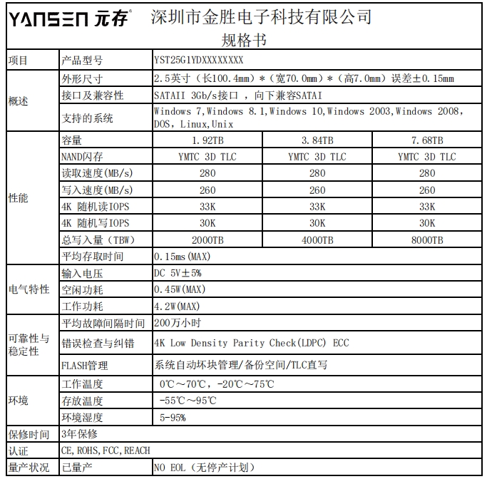 | YST25G1YD3T8WPNNA | YMTC 3D TLC | 3.84TB | 4GB | -20℃~75℃ | 280MB/S | 260MB/S | 4000TB |