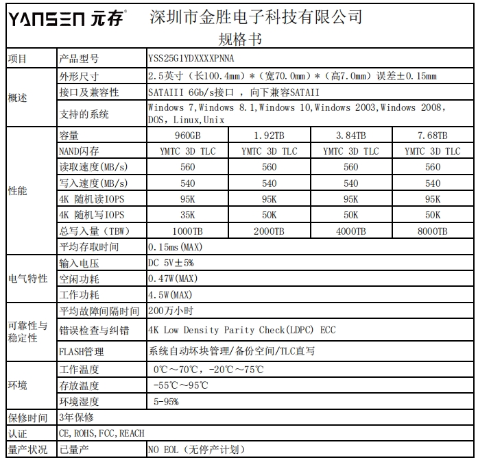 | YSS25G1YD3T8CPNNA | 3D TLC | 3.84TB | 4GB | 0℃~70℃ | 560MB/S | 540MB/S | 4000TB |